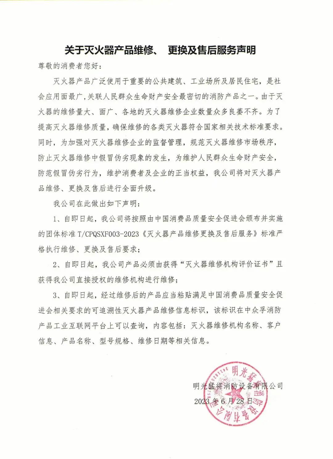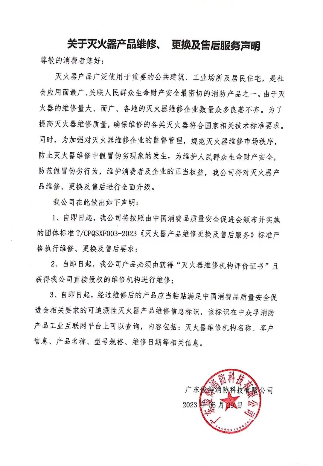 (点击可查看大图) 声明指出:企业将按照由中国消费品质量安全促进会颁布并实施的团体标准T/CPQSXF003-2023《灭火器产品维修、更换及售后服务》团体标准严格执行维修、更换及售后要求。 声明中特别强调:维修机构对生产企业的消防产品进行维修,必须满足两个条件:1、获得“灭火器维修机构评价证书”;2、获得生产企业直接授权。 声明还说到,经过维修后的产品应当粘贴满足中国消费品质量安全促进会相关要求的可追溯性灭火器产品维修信息标识,该标识在中众孚消防产品工业互联网平台上可以查询,内容包括:灭火器维修机构名称、客户信息、产品名称、型号规格、维修日期等相关信息。 江西坤杰消防科技有限公司 徐州市淮海消防器材有限公司 复兴消防科技有限公司 内蒙古火盾消防科技有限公司 广东俊烨消防科技有限公司 明光猛将消防设备有限公司 水力消防科技有限公司 山东国佑消防器材有限公司 南宁市胜安消防设备有限公司 浙江东江消防设备有限公司 北京兴驰盛安消防科技有限公司